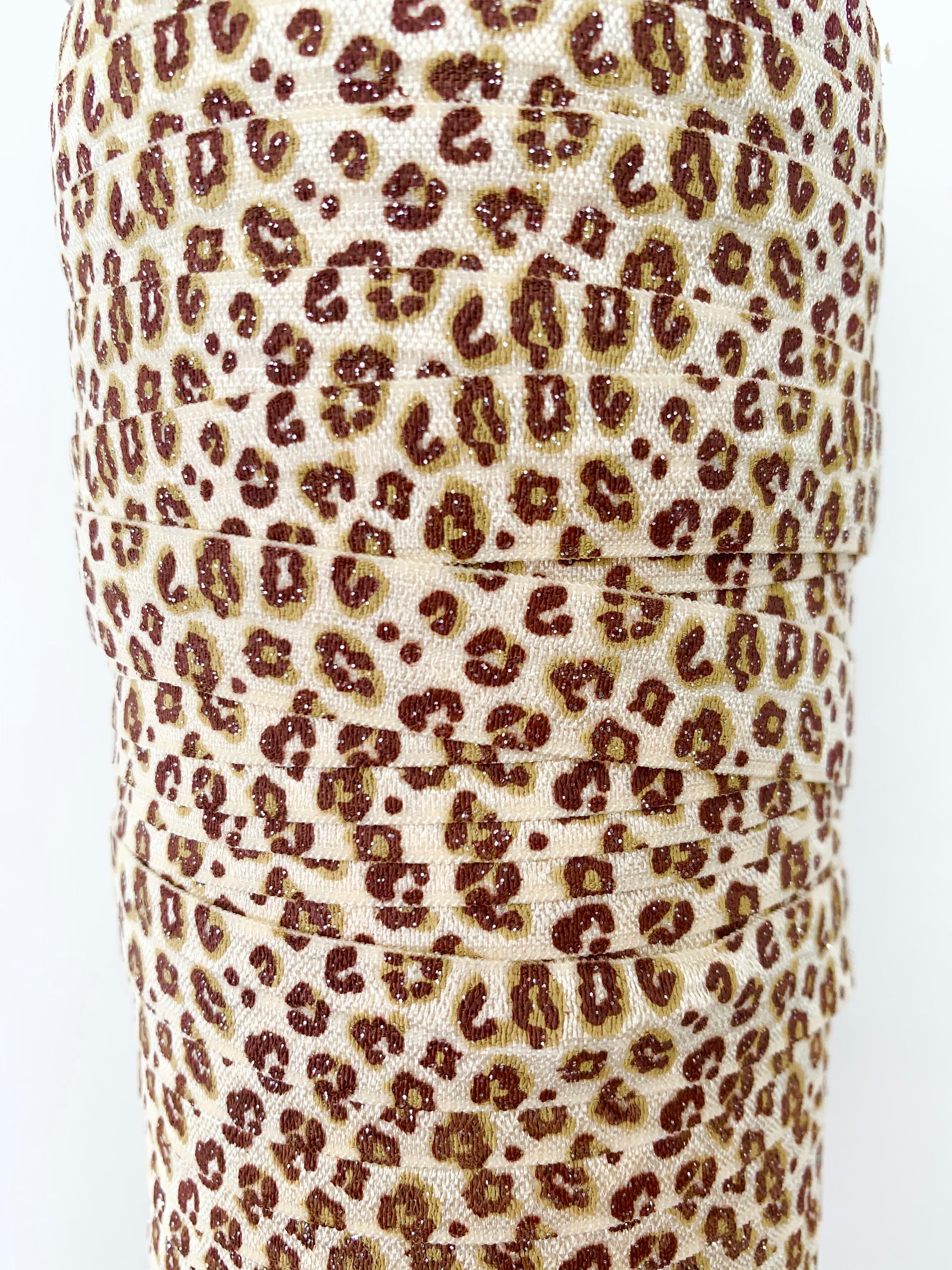 Pretty glitter leopard stretchy 5/8" fold over elastic, sold by the yard.